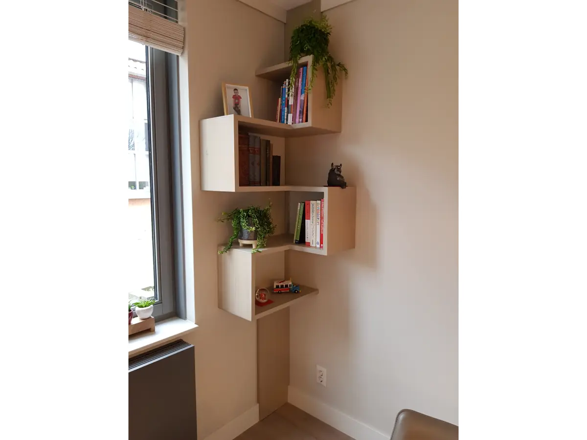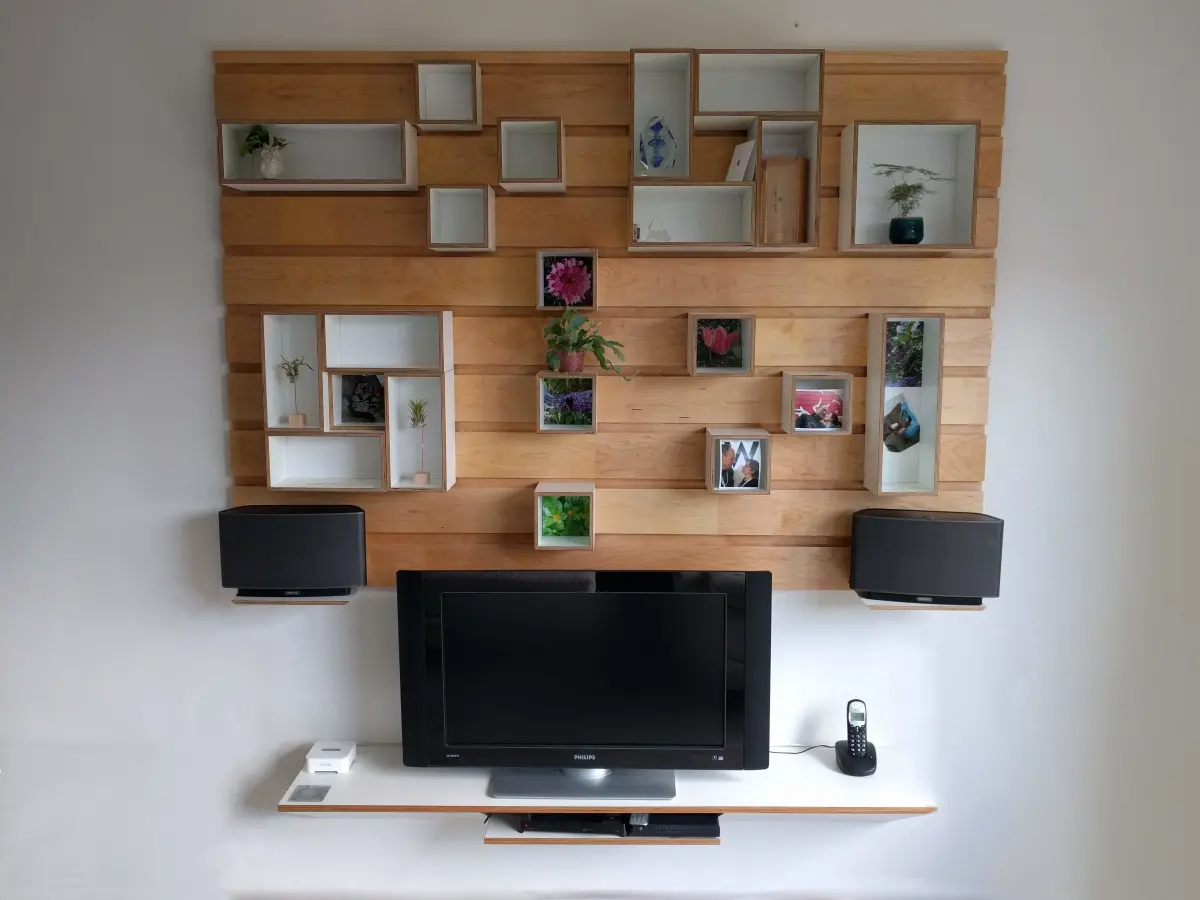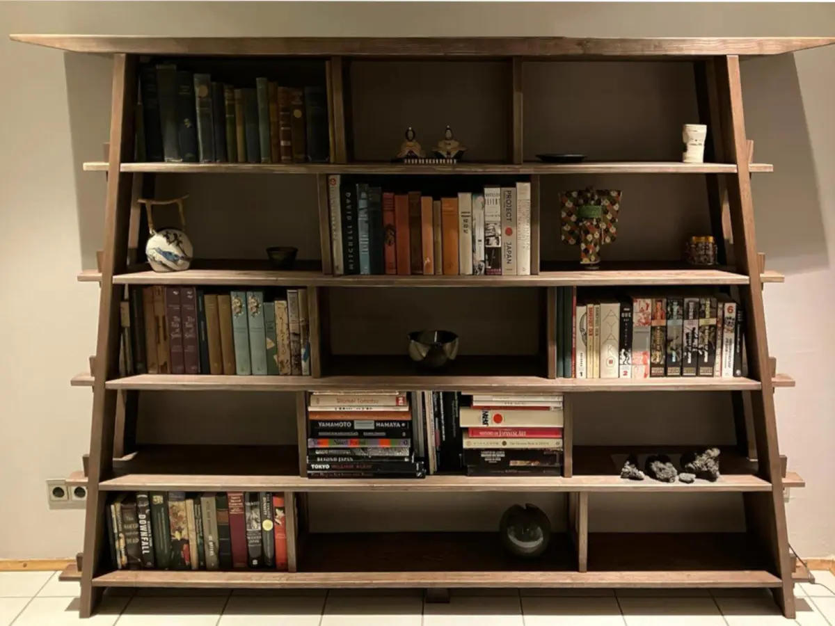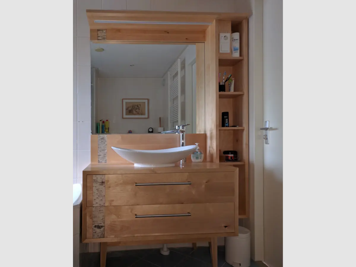 De kast aan de muur erboven is van massief eiken. Hij heeft twee kleppen die door middel van geveerde klepscharen zacht openen en sluiten. De verbindingen van deze kast zijn gemaakt met zwaluwstaarten.