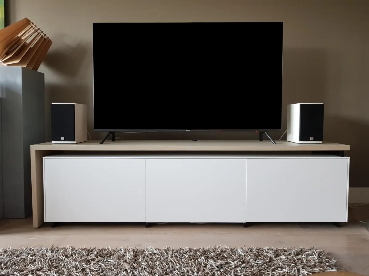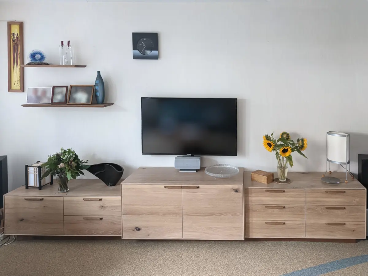 Dit dressoir is 3 meter lang en bestaat uit een deel van 1.2 meter met drie lades en een deel van 1.8 meter met 3 deuren. iDe diepte is 50cm en de hoogte 75cm. Het frame van de kast is van multiplex. De ladefronten, deuren, plint en zijpanelen zijn van gelakt (gespoten) MDF. Het blad is van massief eikenhout.